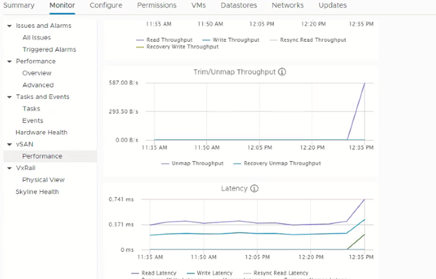 To view if trim & unmap is running, go to an esxi host in the cluster (preferably the one that’s hosting the respective VM), and under the performance tab, view the Trim/Unmap throughput traffic, an increase in unmap traffic will be visible.