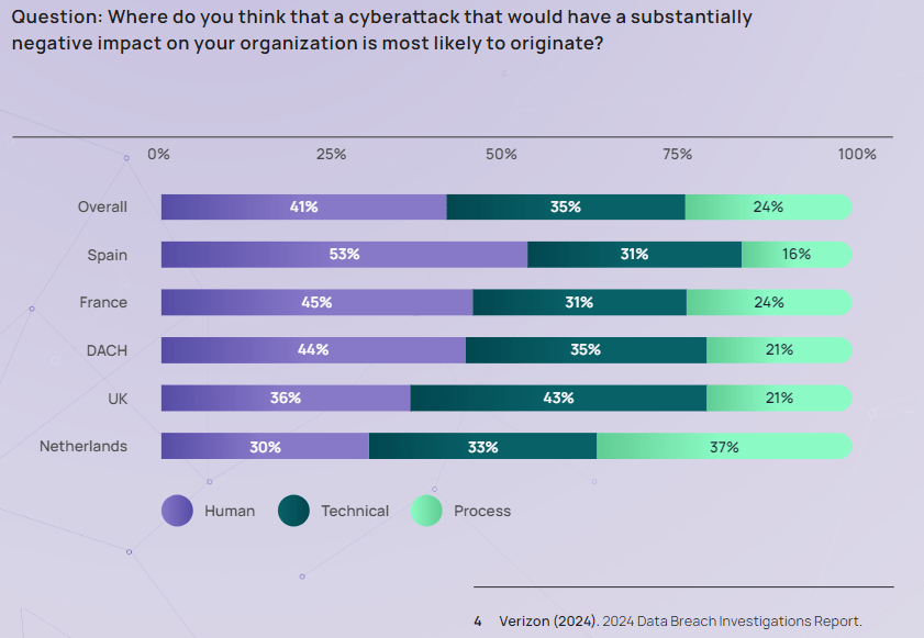 While many security experts anticipate large-scale cyberattacks, a significant portion (41%) believe the most likely threat will originate from human vulnerabilities. This concern is particularly acute in countries like Spain (53%), France (45%), and the DACH region (44%). However, recent reports suggest that these predictions may be underestimating the risk. The Verizon 2024 Data Breach Investigations Report found that up to 68% of breaches last year involved human error, and Forrester predicts this number will climb to a staggering 90% by the end of 2024.